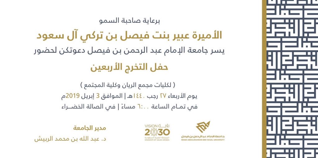 وكالة عمادة شؤون الطلاب لأنشطة الطالبات V Twitter برعاية صاحبة السمو الأميرة عبير بنت فيصل بن تركي آل سعود يسر جامعة الإمام عبدالرحمن بن فيصل دعوتكن لحضور حفل التخرج الأربعين لكليات مجمع